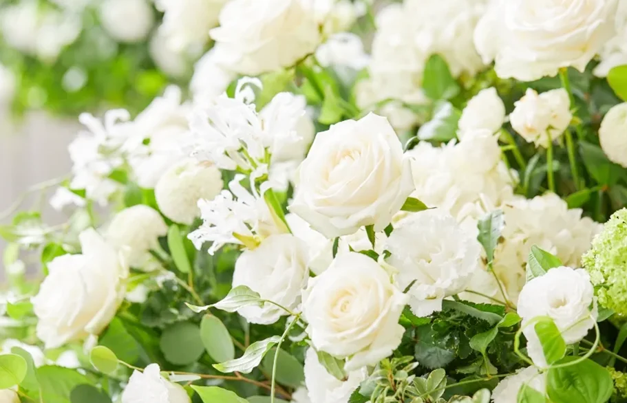 お葬式の祭壇には、大きく分けて「白木祭壇」と「花祭壇」の二種類があります。白木のあたたかみと荘厳が感じられる「白木祭壇」は仏教の教えに則ったもので、長く仏教葬儀の主流でした。しかし家族葬や無宗教の葬儀が増えるにしたがって、自由度の高い「花祭壇」が今は主流になっていきています。 お別れの会においては、無宗教で行うことが一般的であるため、ほとんど場合、花祭壇を飾ります。 葬儀の花というと「白菊」や「白百合」を思い浮かべがちですが、花の種類も多岐にわたっています。故人の好きだった花や故人を彷彿させる花など、葬儀というイメージにとらわれることなく自由に選ぶことが可能です。ご遺族が「明るく華やかに送りたい」と希望すれば、その意向を叶えることができるでしょう。 また、花祭壇は葬儀会場に合わせたアレンジができます。大きな会場での社葬でも、親しい人のみで送る小さな集まりでも、規模に合った無理のない祭壇つくりが可能です。花の種類によっては格調高く、また華やかにも可愛らしくもできるのです。