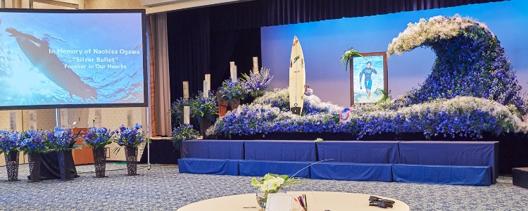 生前に小川直久さんは「ノースショアは自分のサーフィンの限界を試す、限界を知る場所」と語っていらっしゃいました。祭壇に飾られてるサーフボードは、そのパイプラインで行われたパイプライン・マスターズで日本人初のパーフェクト10を記録した際のサーフボードです。また、皆様よりたくさんのお花を寄せていただきまして、故人の愛したノースショアの雰囲気に会場全体が仕上がりました。本当にありがとうございました。